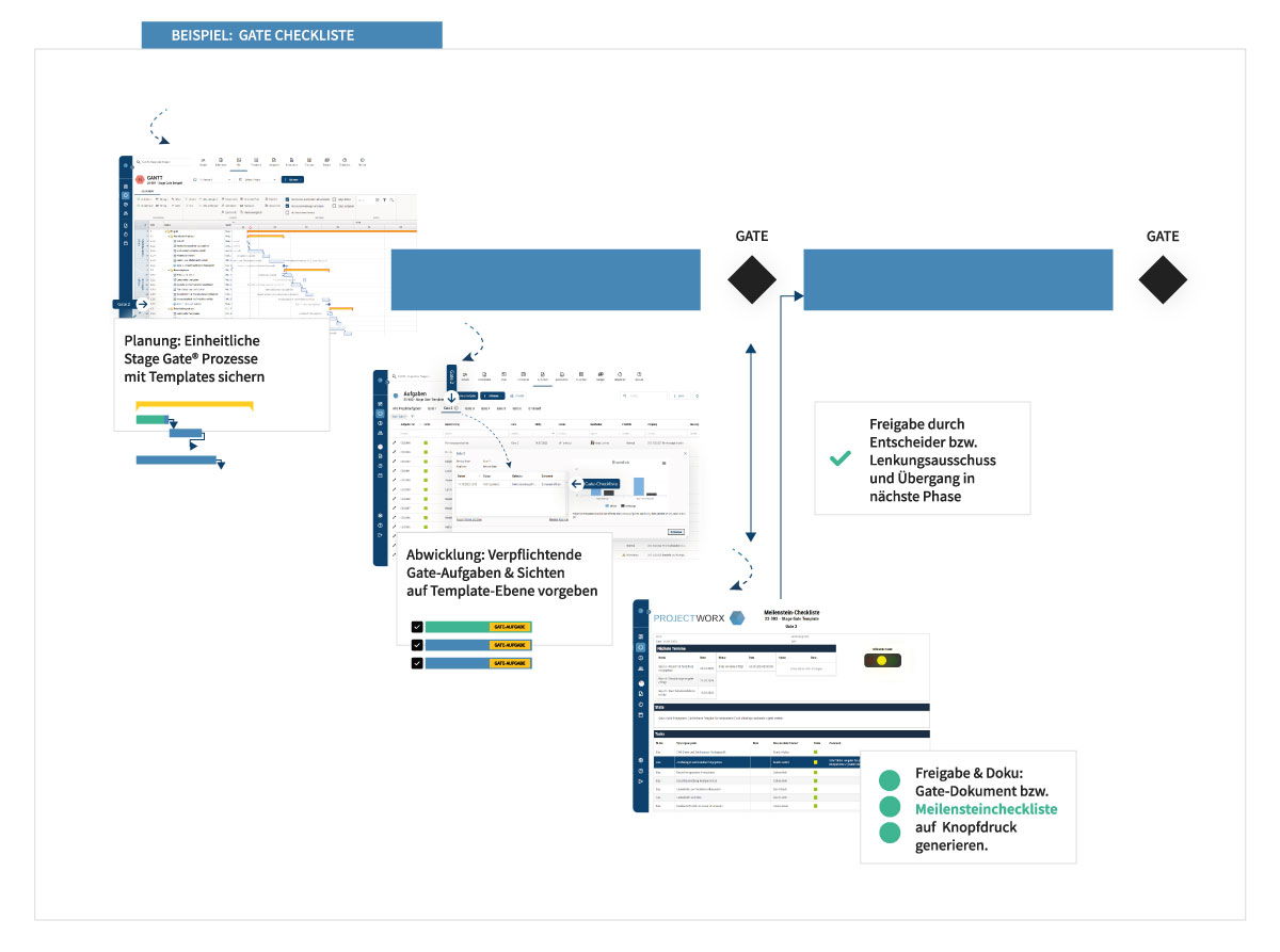 Damit Checklisten als Steuerungsmittel von Projekten und Prozessen funktionieren, ist eine Kopplung von Vorgabe (Planung & Templates) + Abwicklung (Aufgabenmanagement & Checklisten) + Dokumentation (z.B. Gate-Reviews, APQP-Dokumente etc.) essentiell. - Verknüpfung mit Prozessen und Projektphasen