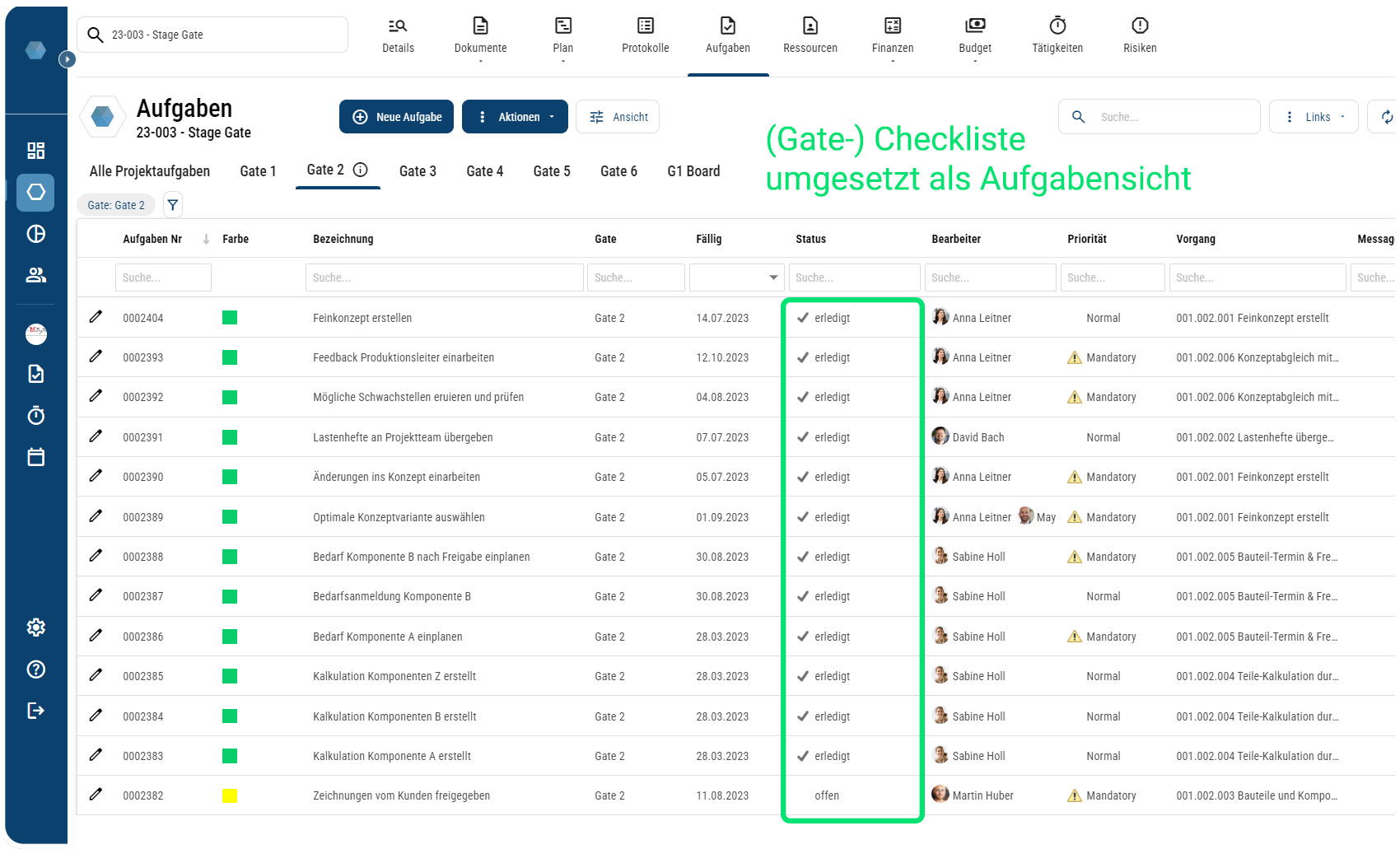 - Aus den Aufgabenlisten werden an den Phasenübergängen/Gates oder bei Reviews Prüfdokumente generiert, die automatisch den Status aktueller Aufgaben oder Probleme dokumentieren.