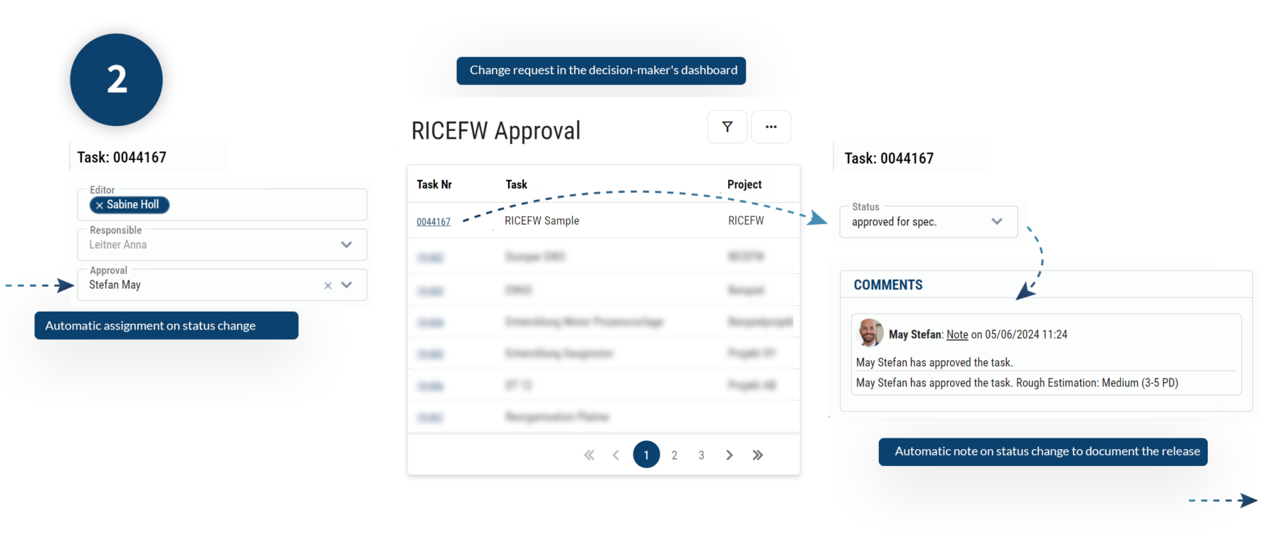 - The RICEFW is then submitted for management approval. Every decision is documented with automatically generated notes. Who approved the change request at what time with what effort estimate? If the task is downgraded or rejected, a justification must also be provided.