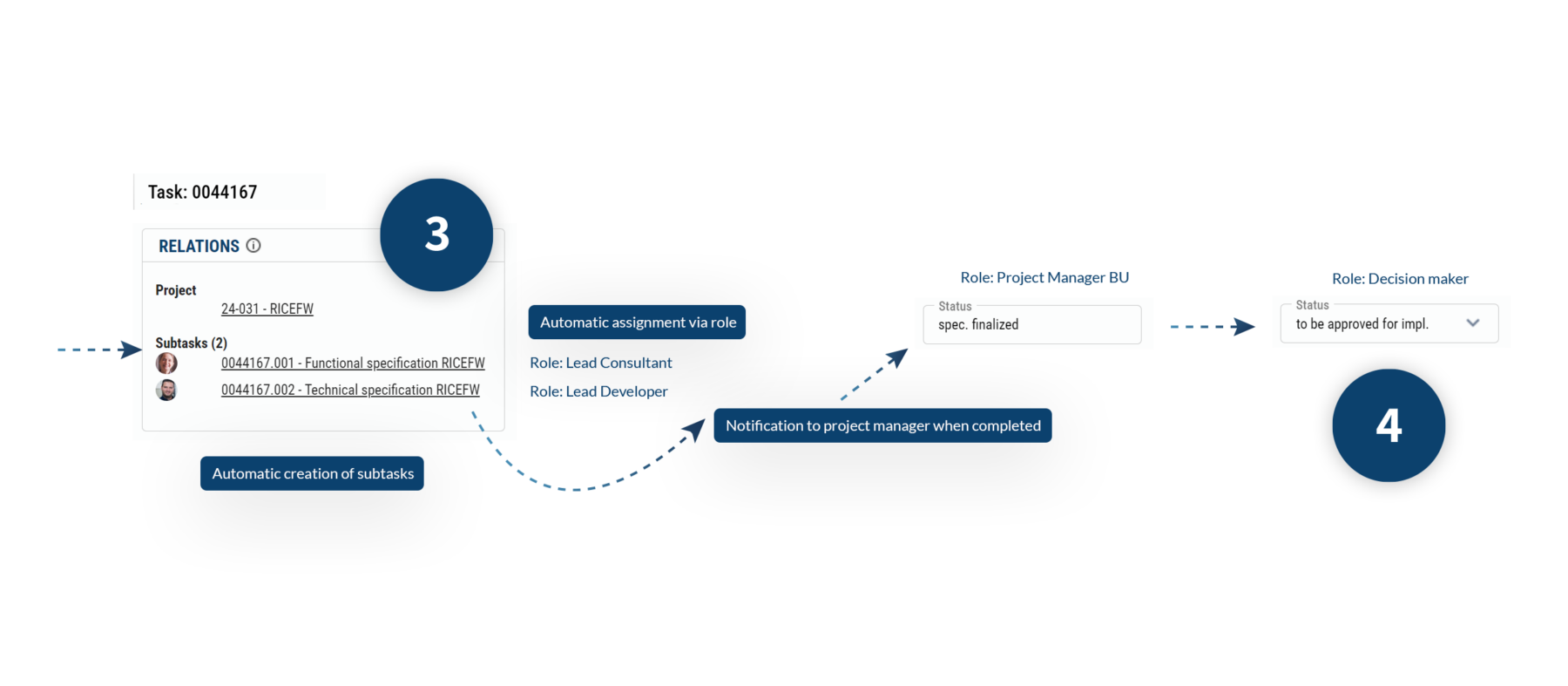 - If the RICEFW is approved for specification, sub-tasks are created to ensure process flows. The responsible editors of the individual sub-tasks are tied to the status. Depending on the status, the system automatically switches the editor for the respective sub-tasks, which change status again upon completion. The task continues this way until the specification is complete.