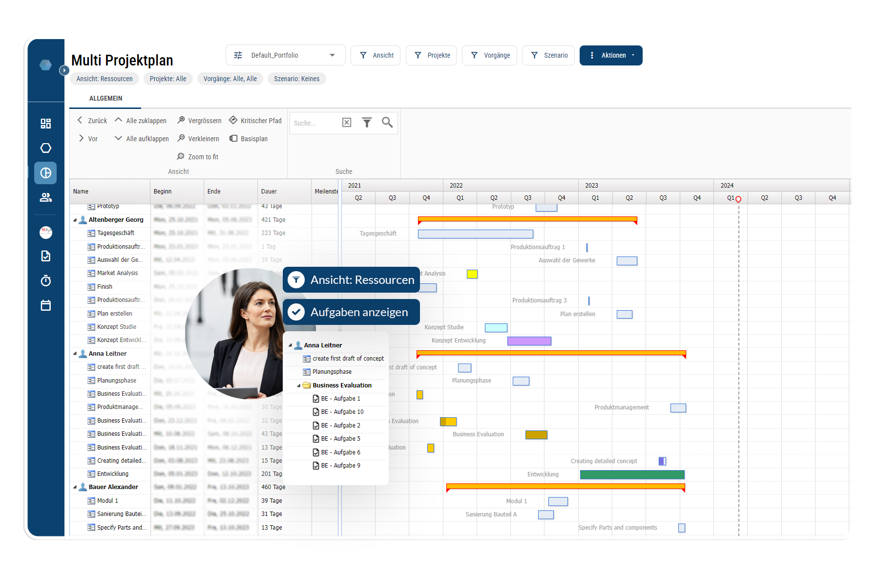 Die Ansicht Ressourcen gliedert Projekte, Teilschritte (und bei Bedarf Aufgaben) anhand der Mitarbeiter/innen, die damit betraut sind.