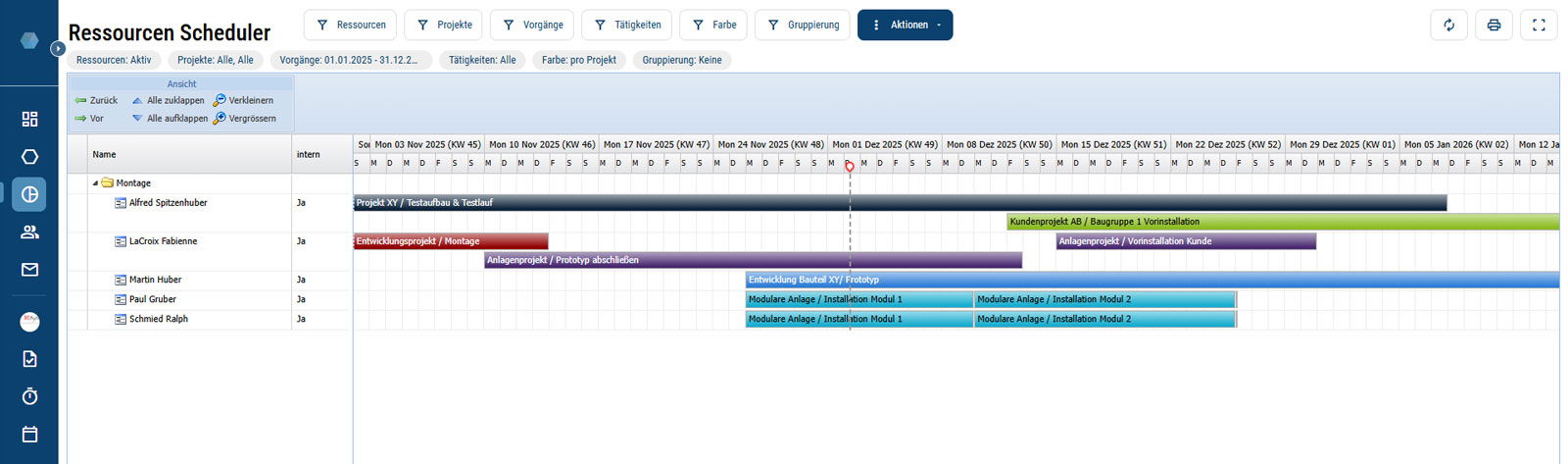Der Ressourcen Scheduler ist eine weitere Ansicht, die gerne von Teamleitern genutzt wird. Sie bietet sich vor allem dann an, wenn nicht zu viele Projekte parallel bearbeitet werden. Liegt der Fokus der Mitarbeiter jeweils auf wenigen Projekten (wie z.B. bei der Inbetriebnahme von Anlagen), bietet der Ressourcen Scheduler einen sehr guten grafischen Überblick darüber, wo die Teammitglieder eingesetzt sind.
